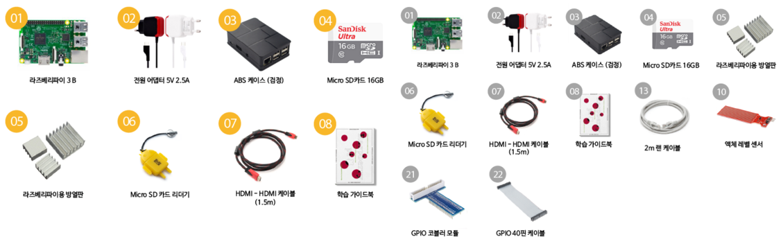 1번 LCD 연결 -> 라즈베리파이, SD카드, SD카드 리더기, HDMI케이블, 5V 2.5A 5핀충전기, 방열판 , 모니터, 키보드, 마우스